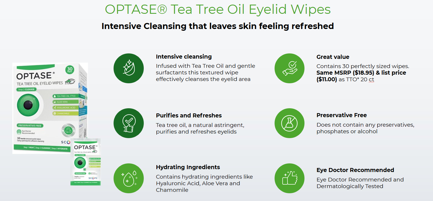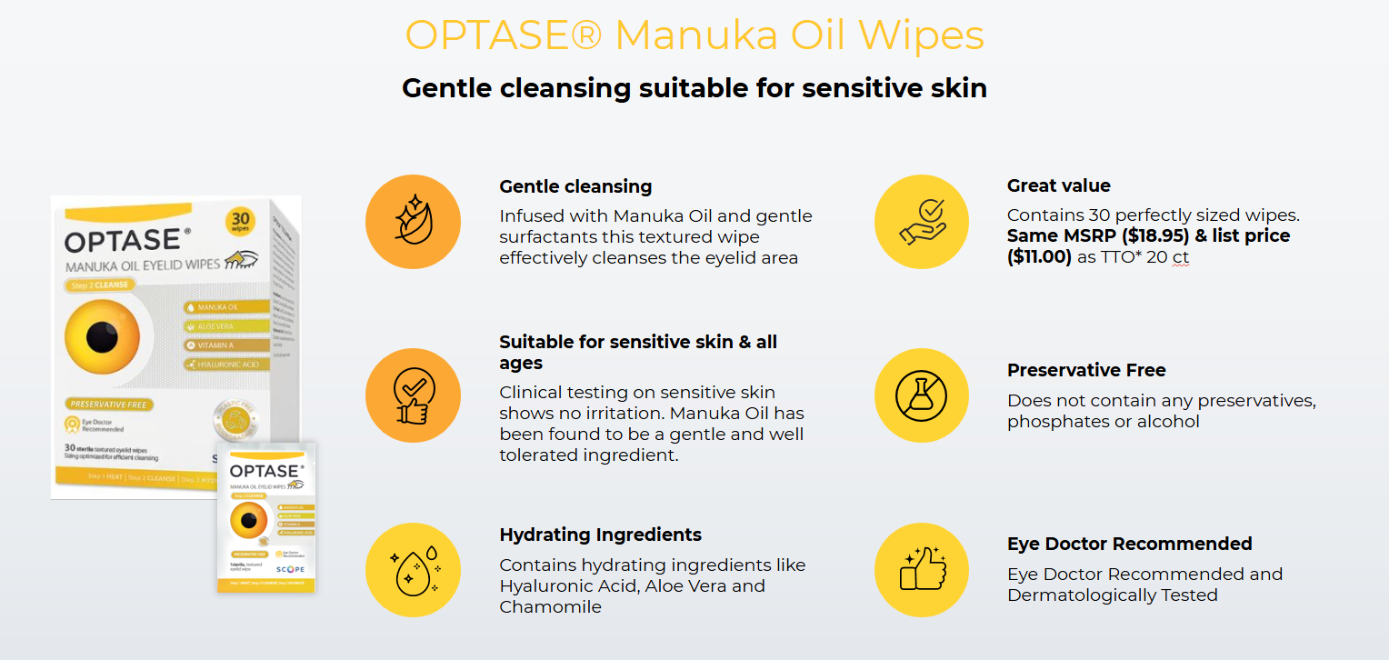 By combining Tea Tree Oil and the moisturizing properties of Hyaluronic Acid, OPTASE® Tea Tree Oil Wipes provides an effective and natural on-the-go cleansing solution for sensitive skin and eyelids.